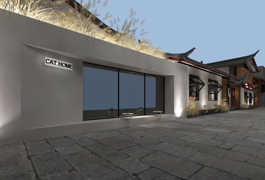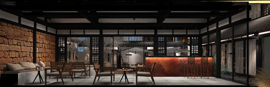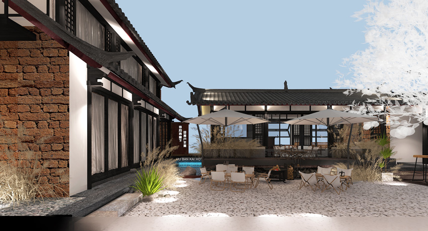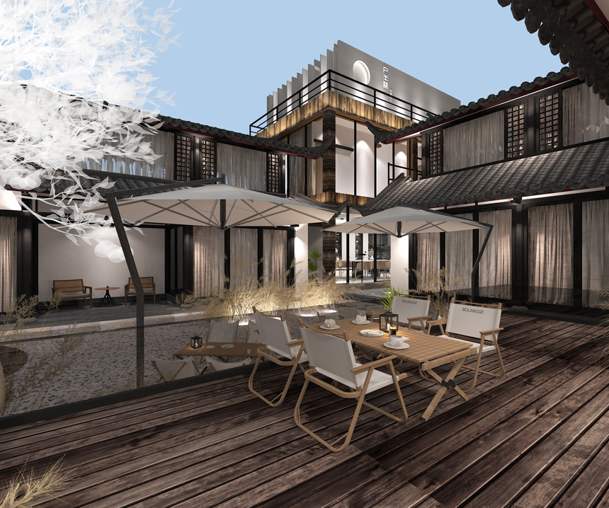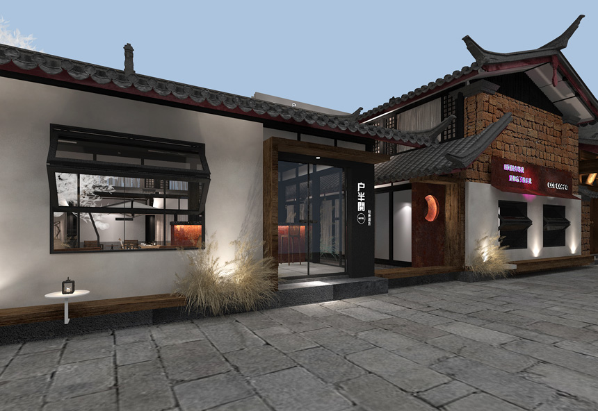 外立面建筑墻頭上面的觀賞草葉呼應(yīng)了—花影浮動的詩意境,古建筑與現(xiàn)代極簡的風(fēng)格的融合,展示了談古論今的時代氣息,也抓住了現(xiàn)代的審美親和力,走進(jìn)院落是回歸古樸的古建庭院,從空間體驗給到店的人傳遞一種遠(yuǎn)離喧囂都市的寧靜感,在建筑頂層高處,營造圓月的造型視覺,表達(dá)滿月的視覺效果,寓意幸福美滿。