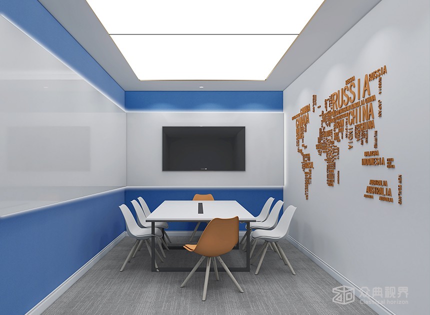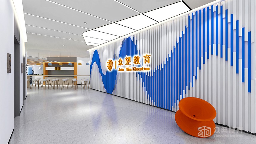 北京眾望教育,項目面積2000㎡,是一家教育平臺公司,公司的員工很年輕,因此設(shè)計風格偏年輕化、活潑、動感。在設(shè)計中,采用了企業(yè)色的飽和度比較高的藍色和橙色,大量的運用色塊,使得整個空間非常的有活力。