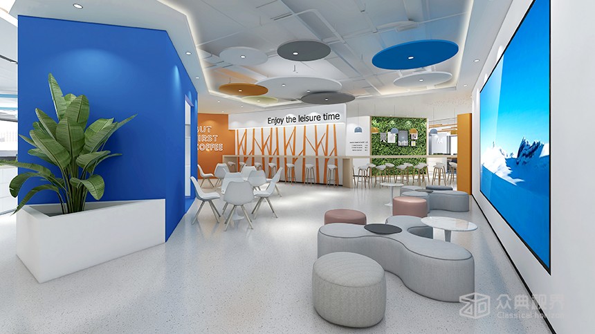 中島休閑區(qū),是聯(lián)通前廳等候和辦公區(qū)的主要通道,設(shè)計出靈動、休閑的一個茶歇區(qū)。墻面靠墻吧臺和等候區(qū)吧臺渾然一體。天花采用裸頂噴漆,局部邊吊,中間采用多色圓形石膏板造型組合來裝飾。