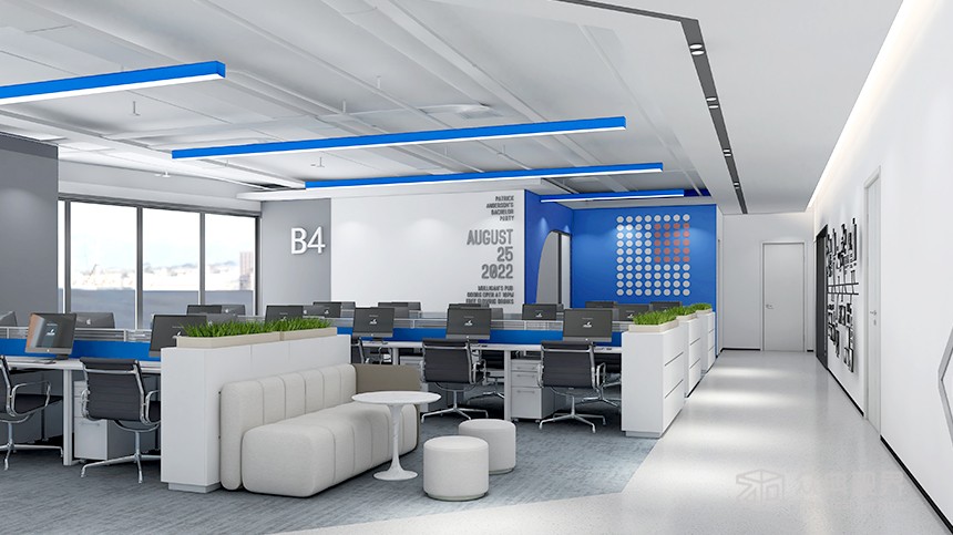 休閑區(qū)的此面墻,設(shè)計為LED電子大屏,既可以為客戶播放企業(yè)文化,也可以成為小組開會播放PPT的區(qū)域。貫穿辦公區(qū)和茶歇區(qū)的打印室,設(shè)計為兩面通透的藍色獨立小房子,非常醒目,顏色成為空間劃分的主要方式。