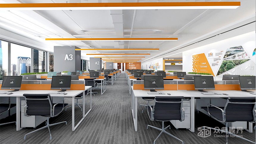 辦公區(qū)分為A區(qū)和B區(qū),A區(qū)采用企業(yè)色橙色為主題色,工位屏風和LED燈均采用橙色。走道地面采用仿水磨石的石塑地板,走道天花,靠近墻體的設(shè)計了燈池,靠近工位則設(shè)計為暗藏軌道燈。