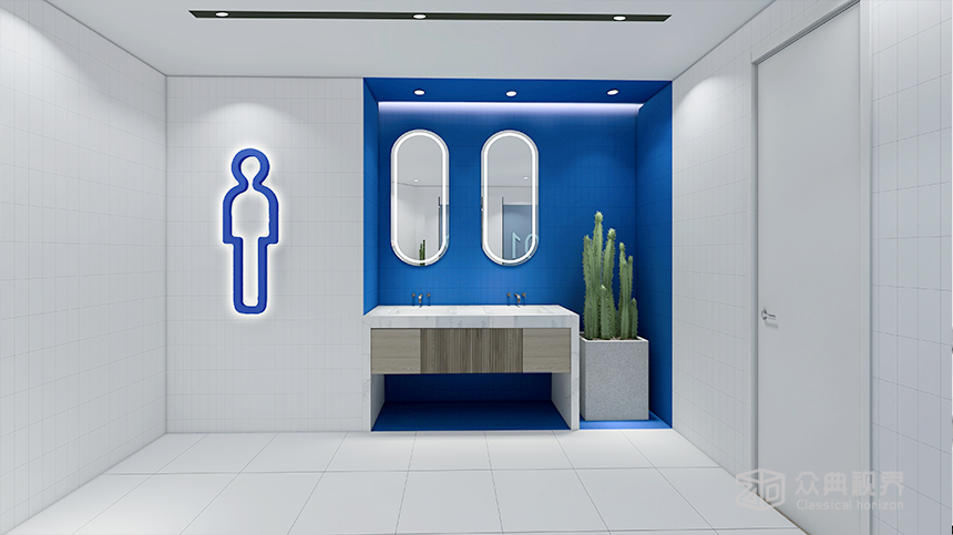 衛(wèi)生間男衛(wèi)采用藍色,(女衛(wèi)可以用橙色),來作為空間的點綴色。洗手臺上面采用燈帶,洗手區(qū)的色塊,讓空間渾然一體,而又獨立之外,搭配綠植,顯得空間簡約而不簡單。