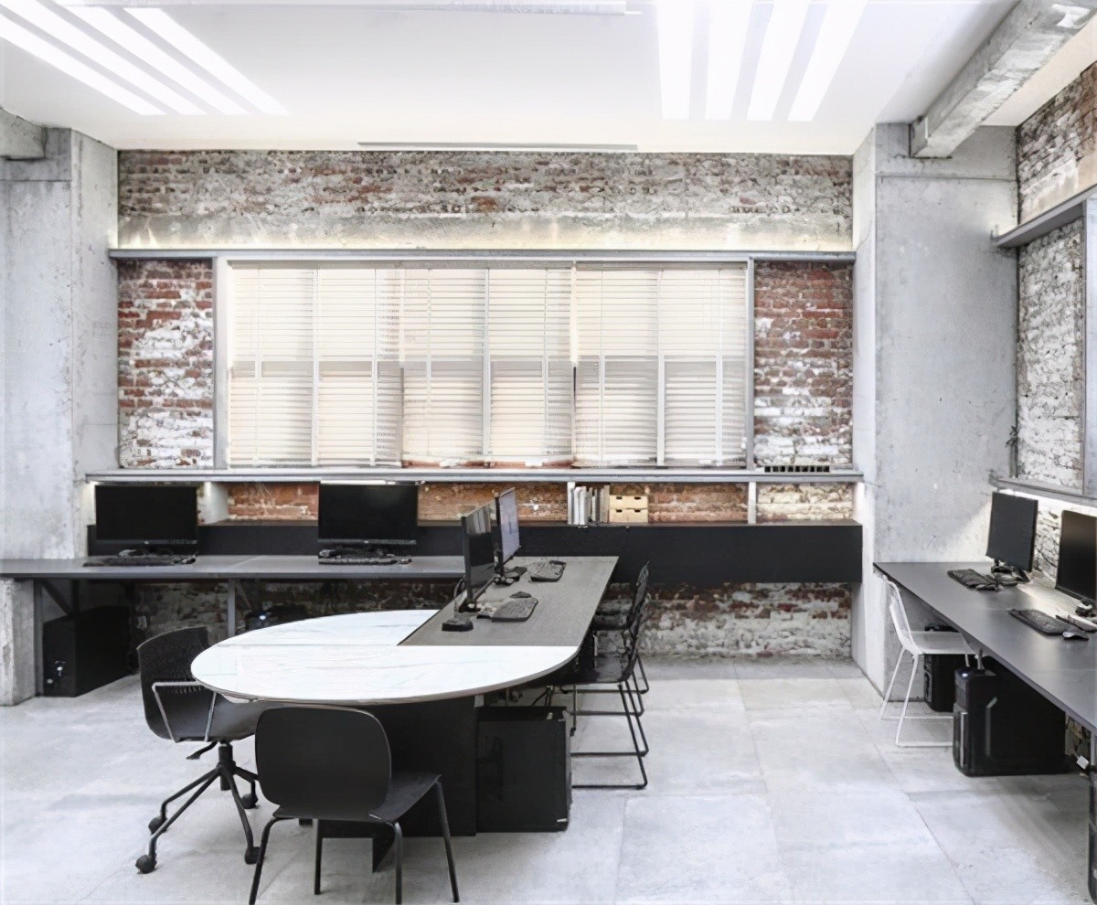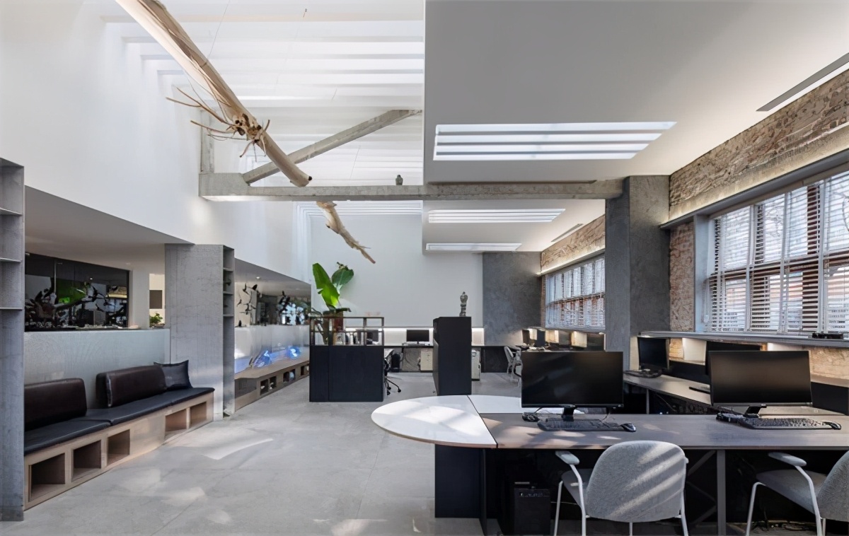 設(shè)計師們保留了老建筑的原始磚墻,只對吊頂做了百葉格柵的造型設(shè)計,與陽光順向的造型也起到了調(diào)節(jié)空間光線的作用,另外這個地方我們還吊掛了一棵一分為二的大樹。使用率較高的地方叫做“工作空間”,把較好的南北方向空間給到整個的工作空間,用較流暢的動線來組合這個部分。